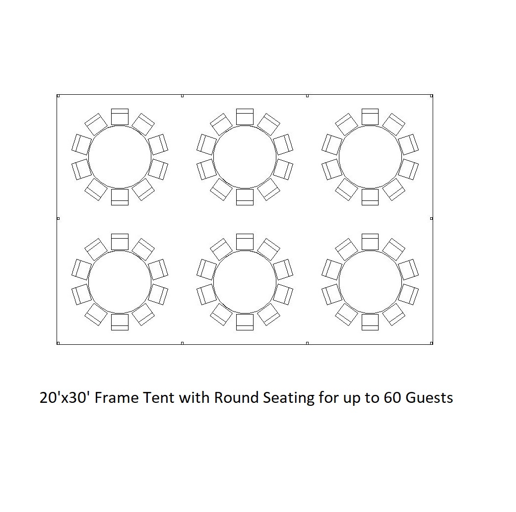 Diagram and Seating Chart of a 20×30 Frame Tent with Rectangular Table Seating for 60 guests great for party rentals and corporate special events