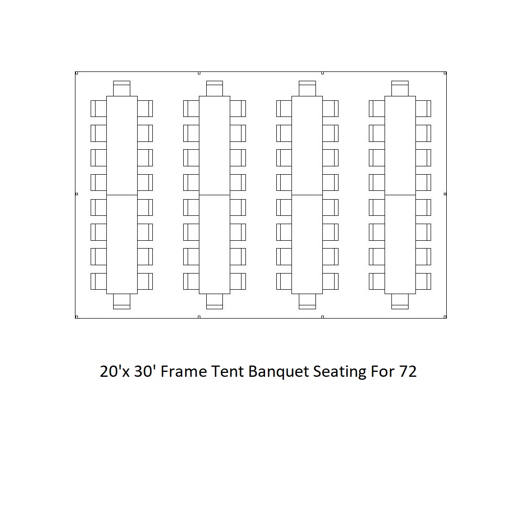 Diagram and Seating Chart of a 20x30 Frame Tent with Rectangular Table Seating for 72 guests great for party rentals and corporate special events